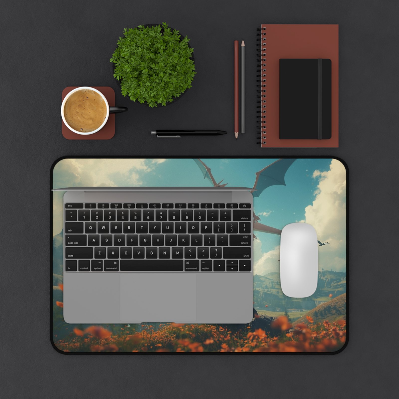 Spread out a scene of wide skies and distant mountains across your workspace. This neoprene desk mat brings a breath of adventure to writing, gaming, or sketching — a soft, supportive surface beneath your keyboard and mouse that resists slipping and fraying. The printed artwork captures golden light, drifting petals, and a lone figure facing a dragon, inviting quiet focus and a touch of epic storytelling to every task. Thoughtfully hemmed and printed in vivid color, it’s built to stay vibrant through daily use and to anchor creative corners with a cinematic mood.
