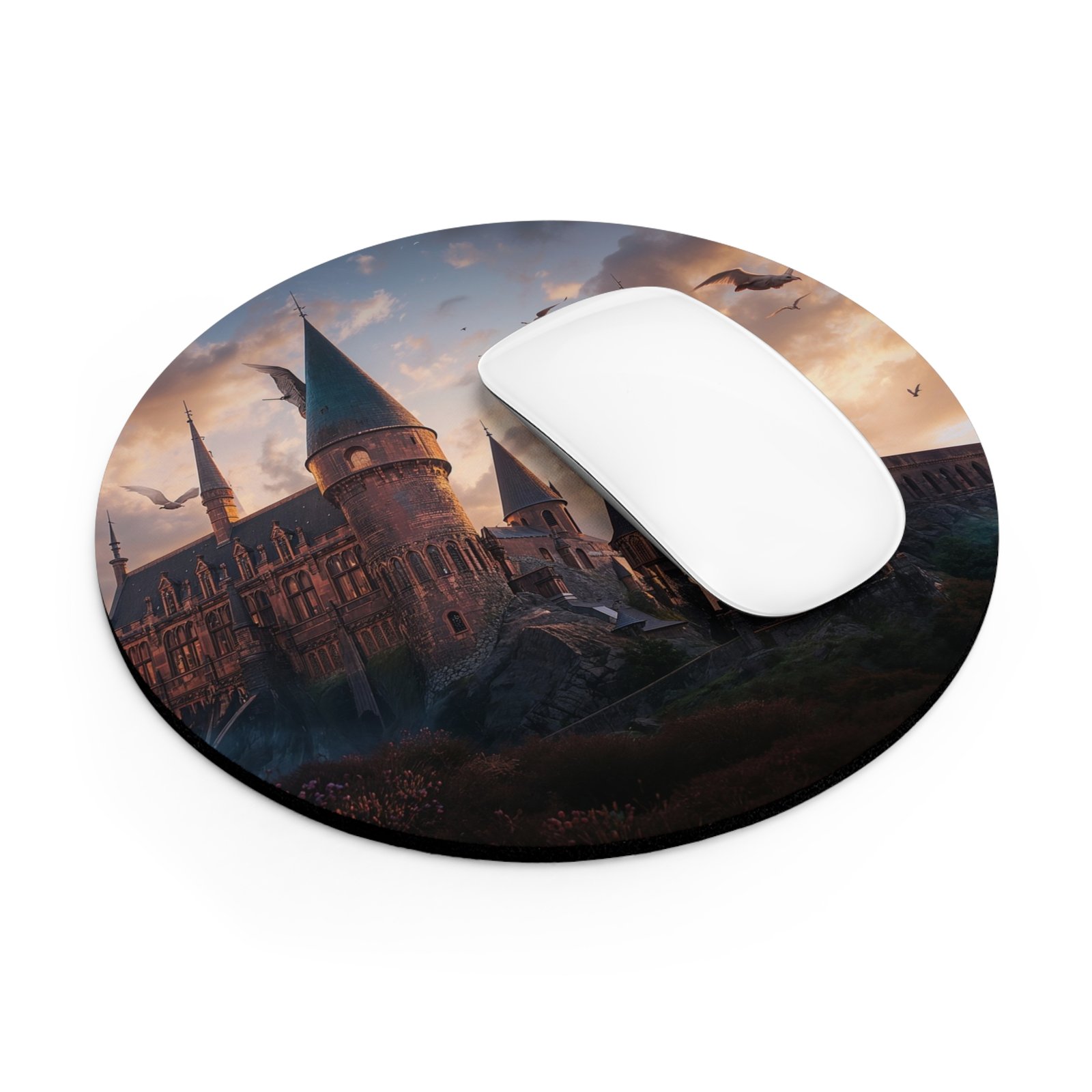 Settle into late-night study sessions or long creative sprints with a mouse pad that feels like a tiny window to another world. The cushioned neoprene surface gives your wrist a soft landing while the richly printed scene draws you into a twilight castle perched against a storm-touched sky. The textured, non-slip rubber base keeps the pad anchored when your workflow heats up. Choose round or rectangular to match your desk layout — this pad blends practical comfort with a quietly magical atmosphere that turns ordinary screen time into a little ritual.