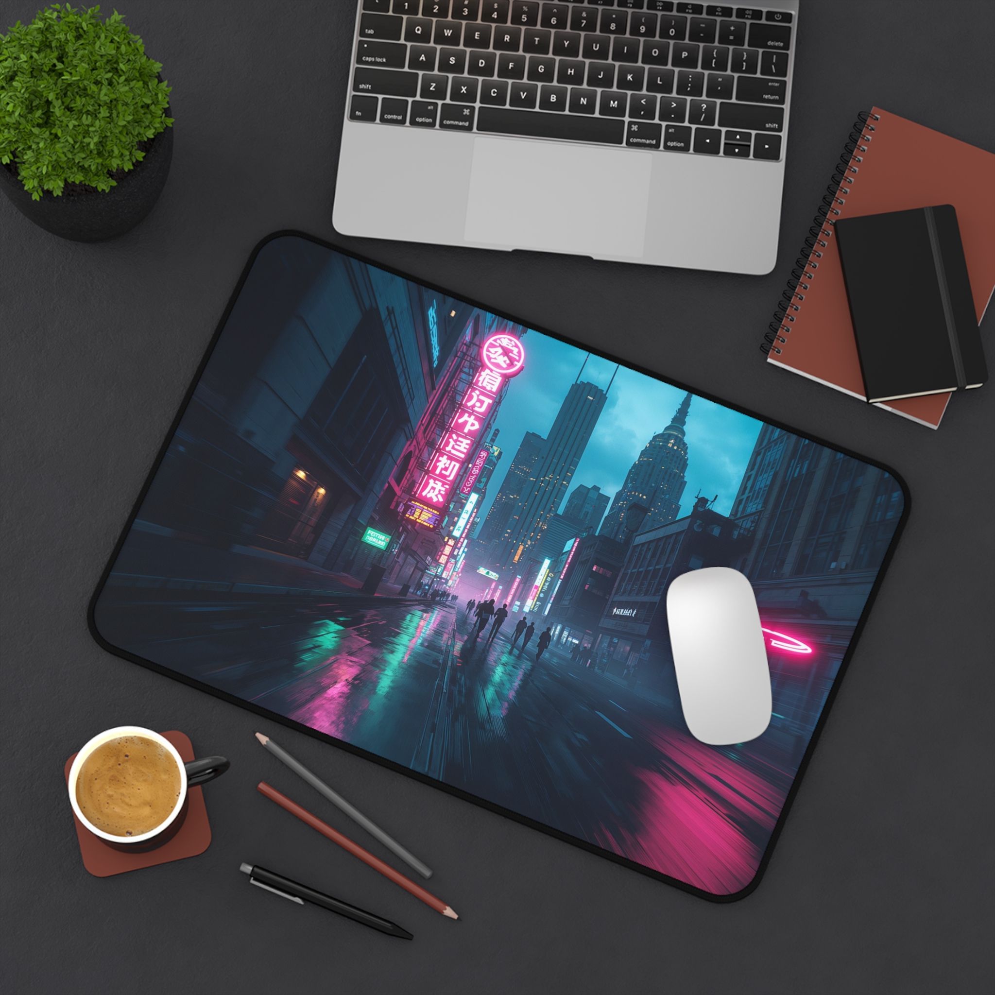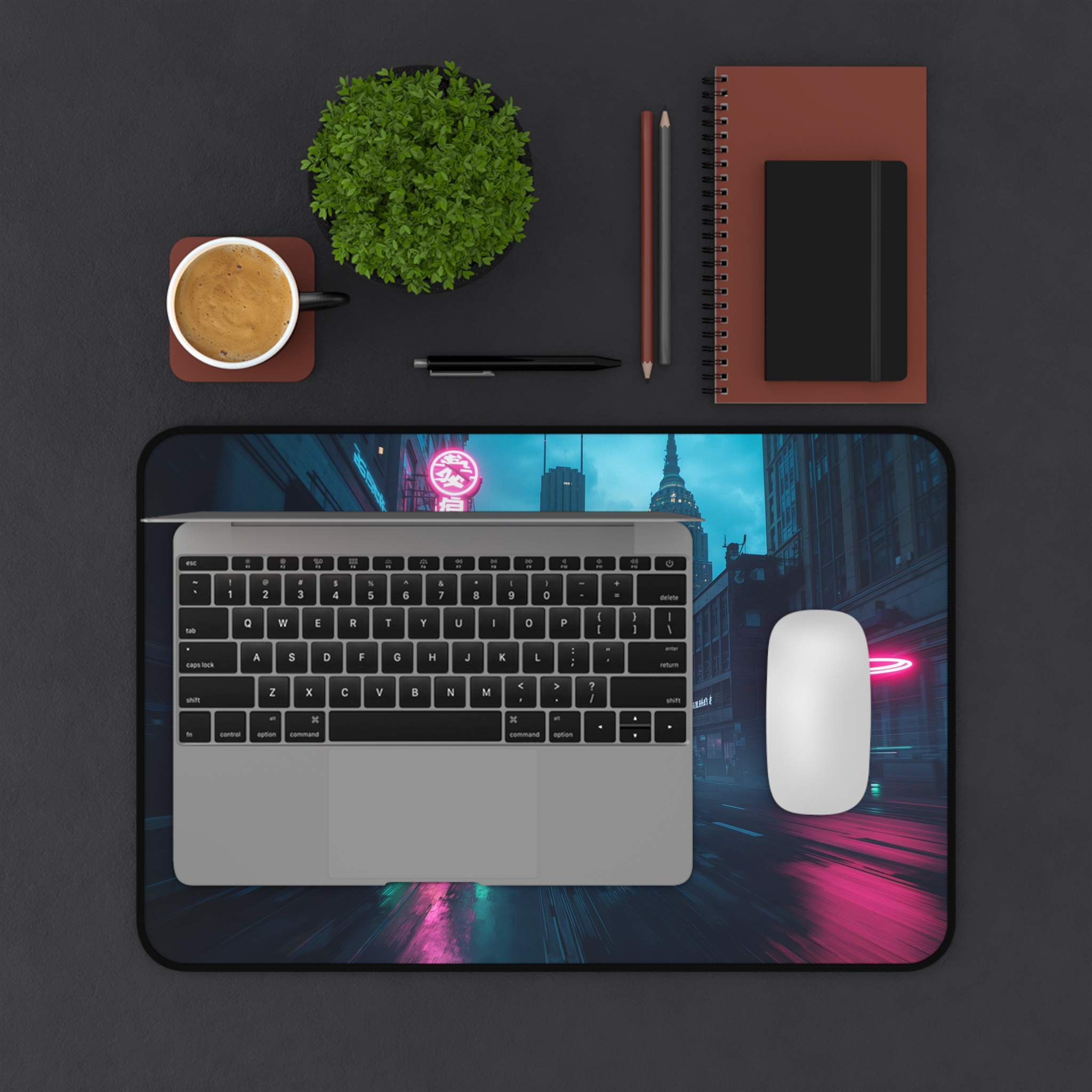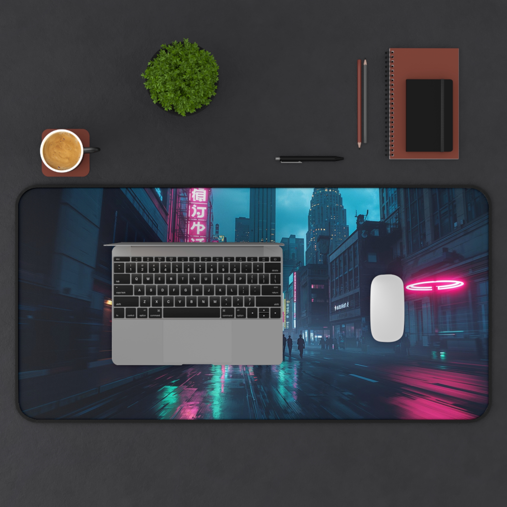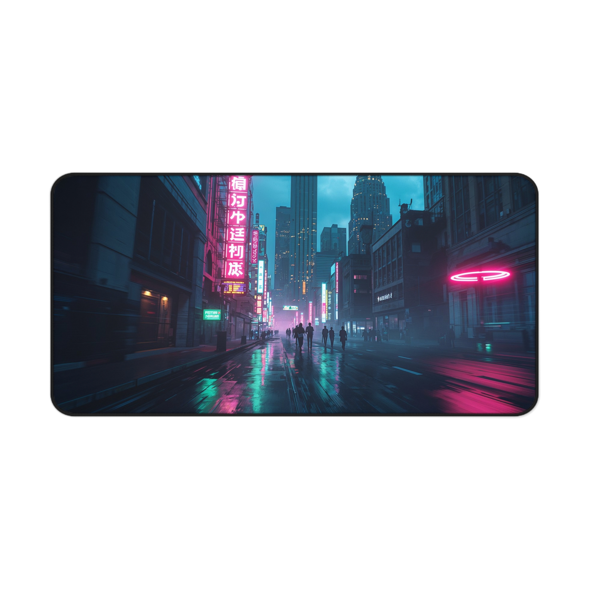 Rain-slick streets glow in neon. This desk mat brings that late-night, cybercity vibe to your workspace — cool blues and magentas shimmer across a smooth neoprene canvas while raindrop reflections stretch toward a distant skyline. It anchors your keyboard and mouse, cushions your wrists during long sessions, and turns ordinary desk tasks into something cinematic. Lay it down for focused work, late-night writing, or when you want your setup to feel like a scene from a futuristic alleyway. Durable hemmed edges and a textured, non-slip base mean it stays put through typing marathons and creative bursts. If your desk needs atmosphere, this mat adds mood and function in equal measure.
