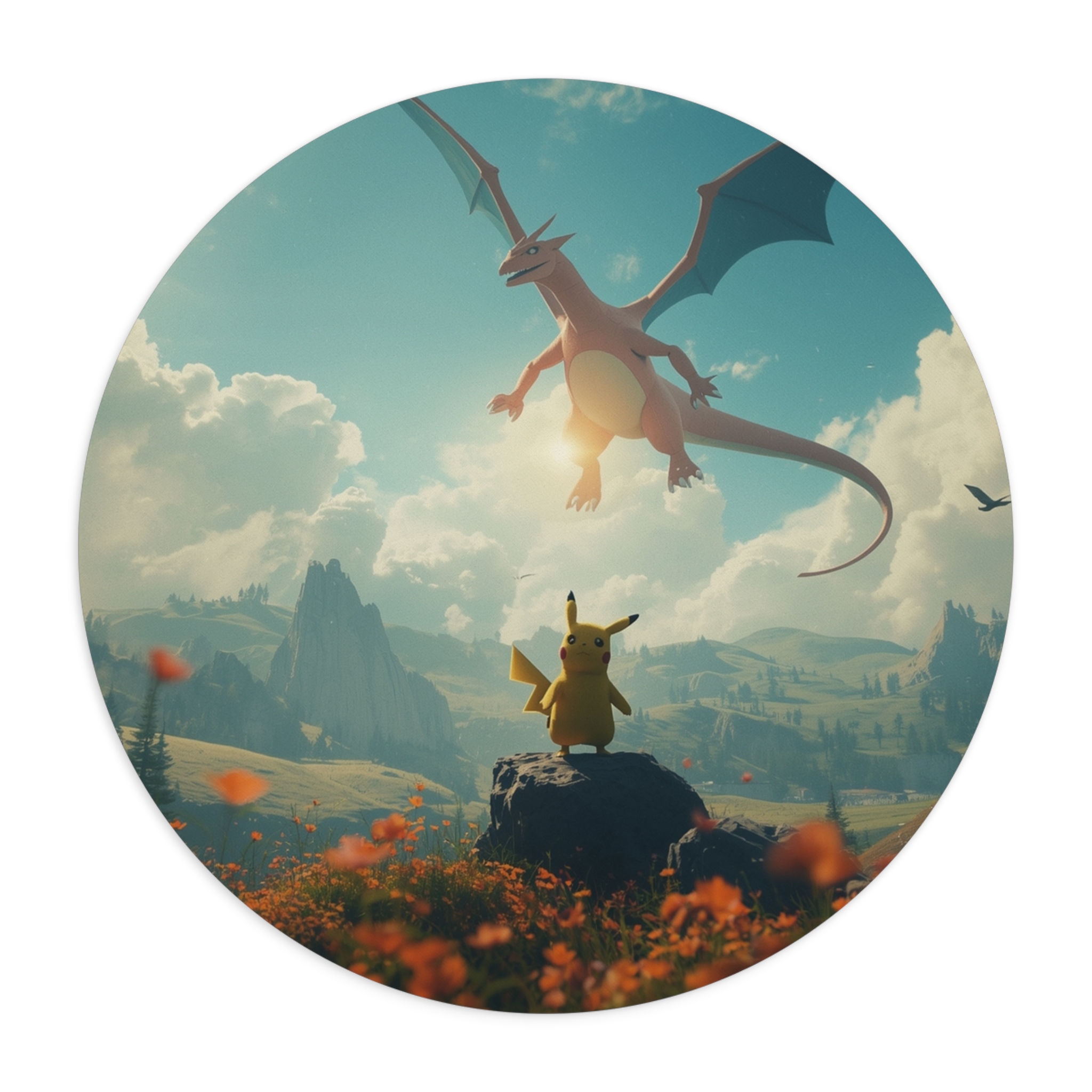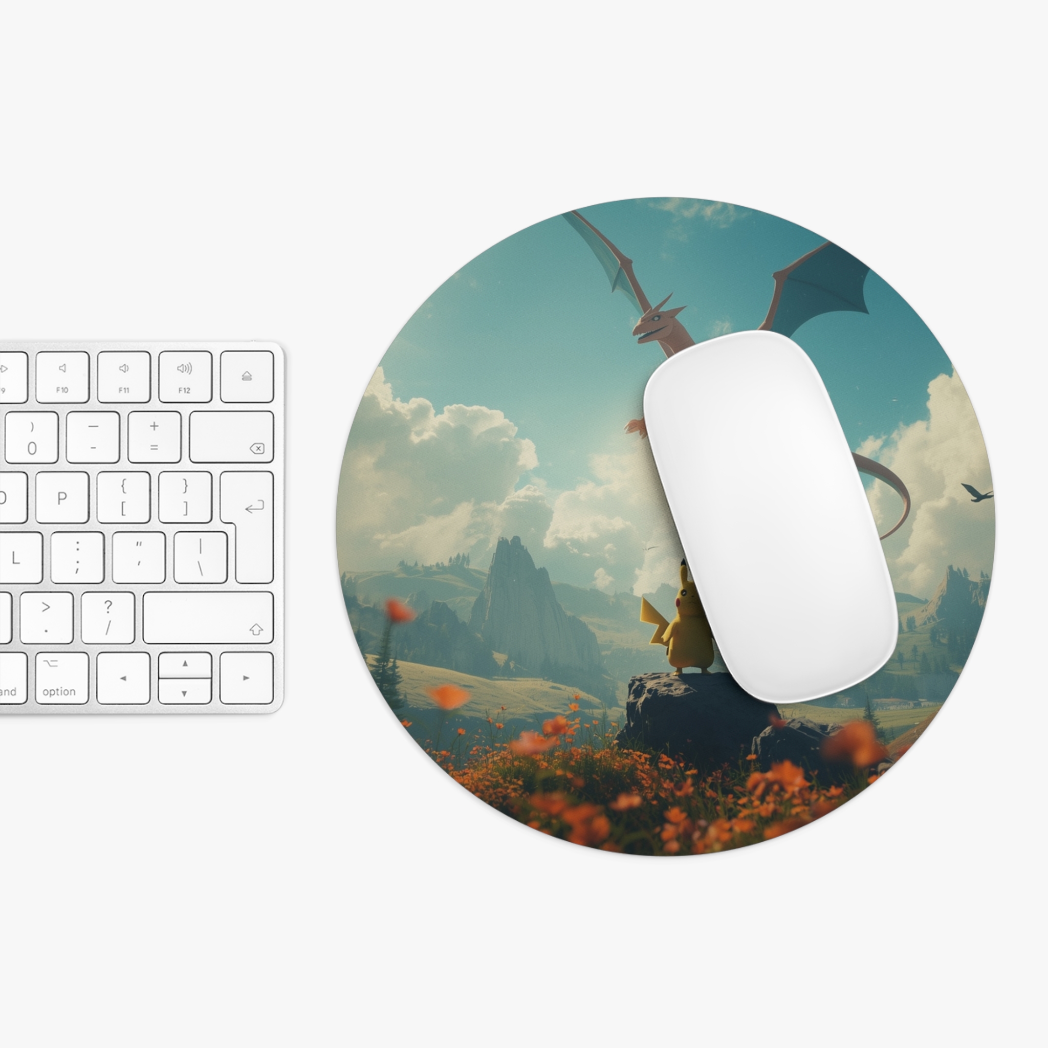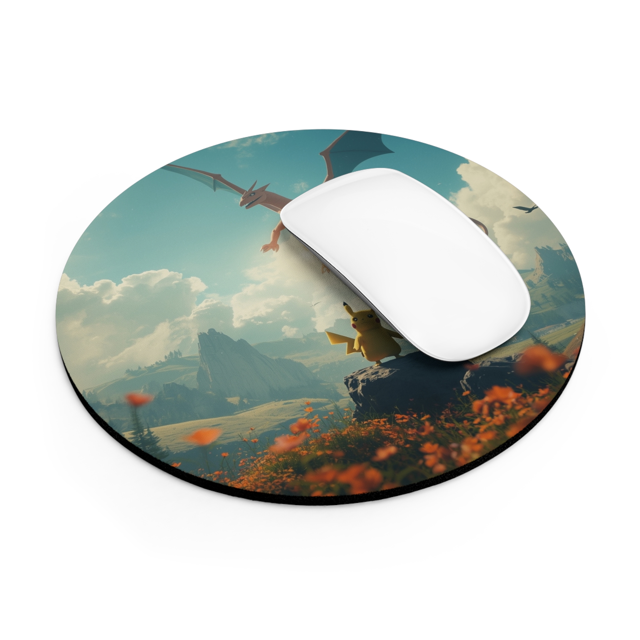 A soft, vibrant neoprene mouse pad that brings a touch of adventure to your desk. The one-sided print captures a sweeping, storybook scene—small and brave figures facing a soaring dragon above sunlit valleys—rendered in bright, cinematic color. At 1/4″ thickness the pad feels cushioned under your hand while the non-slip rubber underside keeps it steady during long sessions. Choose round or rectangular to match your setup. This mouse pad slips into daily routines as a quiet spark of nostalgia and wonder, turning ordinary clicks into moments that feel a little more epic.