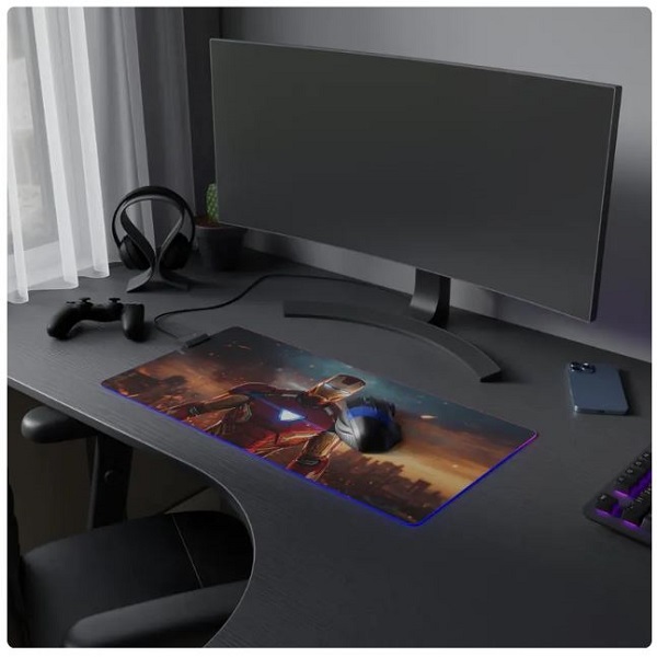 A high-end illuminated mouse pad designed for gamers, engineers at heart, and fans of modern heroic universes.