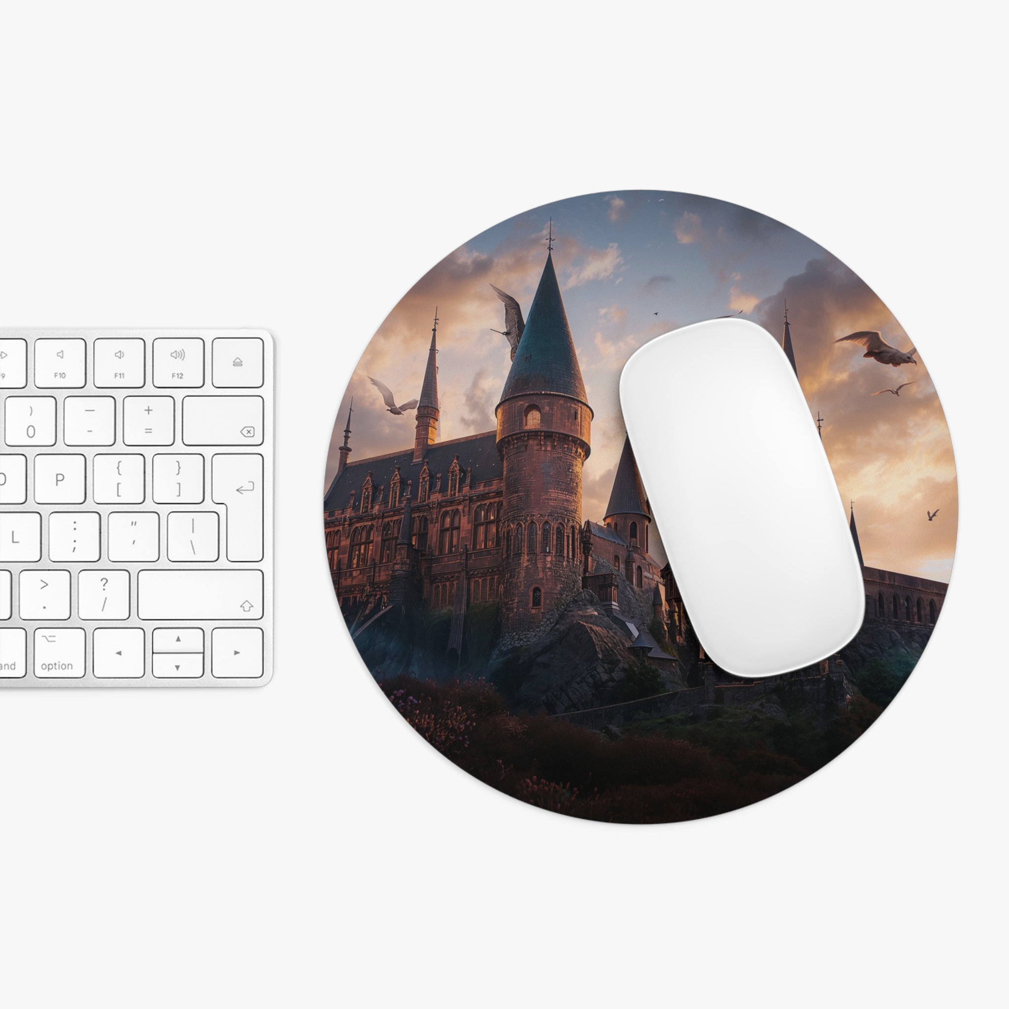 Settle into late-night study sessions or long creative sprints with a mouse pad that feels like a tiny window to another world. The cushioned neoprene surface gives your wrist a soft landing while the richly printed scene draws you into a twilight castle perched against a storm-touched sky. The textured, non-slip rubber base keeps the pad anchored when your workflow heats up. Choose round or rectangular to match your desk layout — this pad blends practical comfort with a quietly magical atmosphere that turns ordinary screen time into a little ritual.