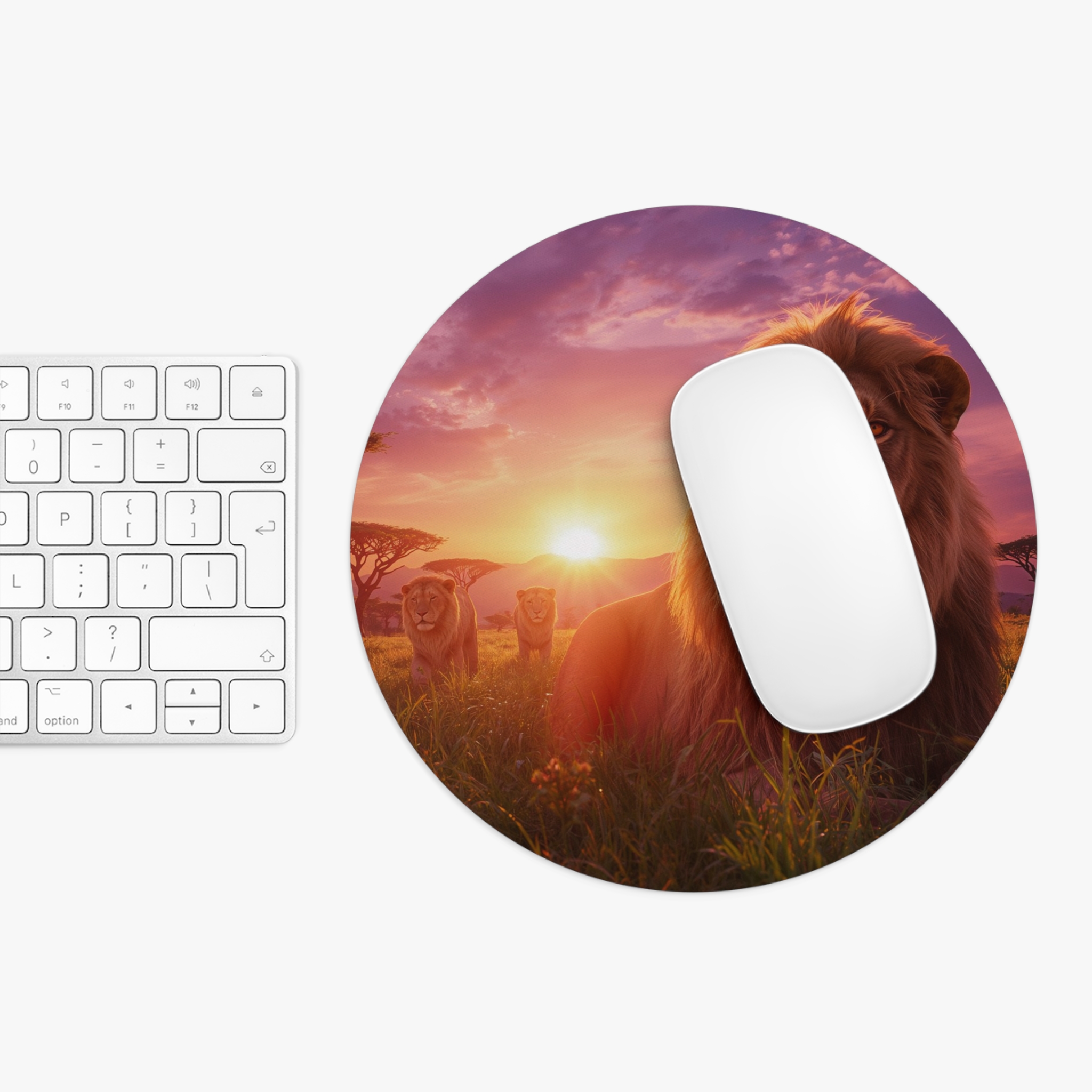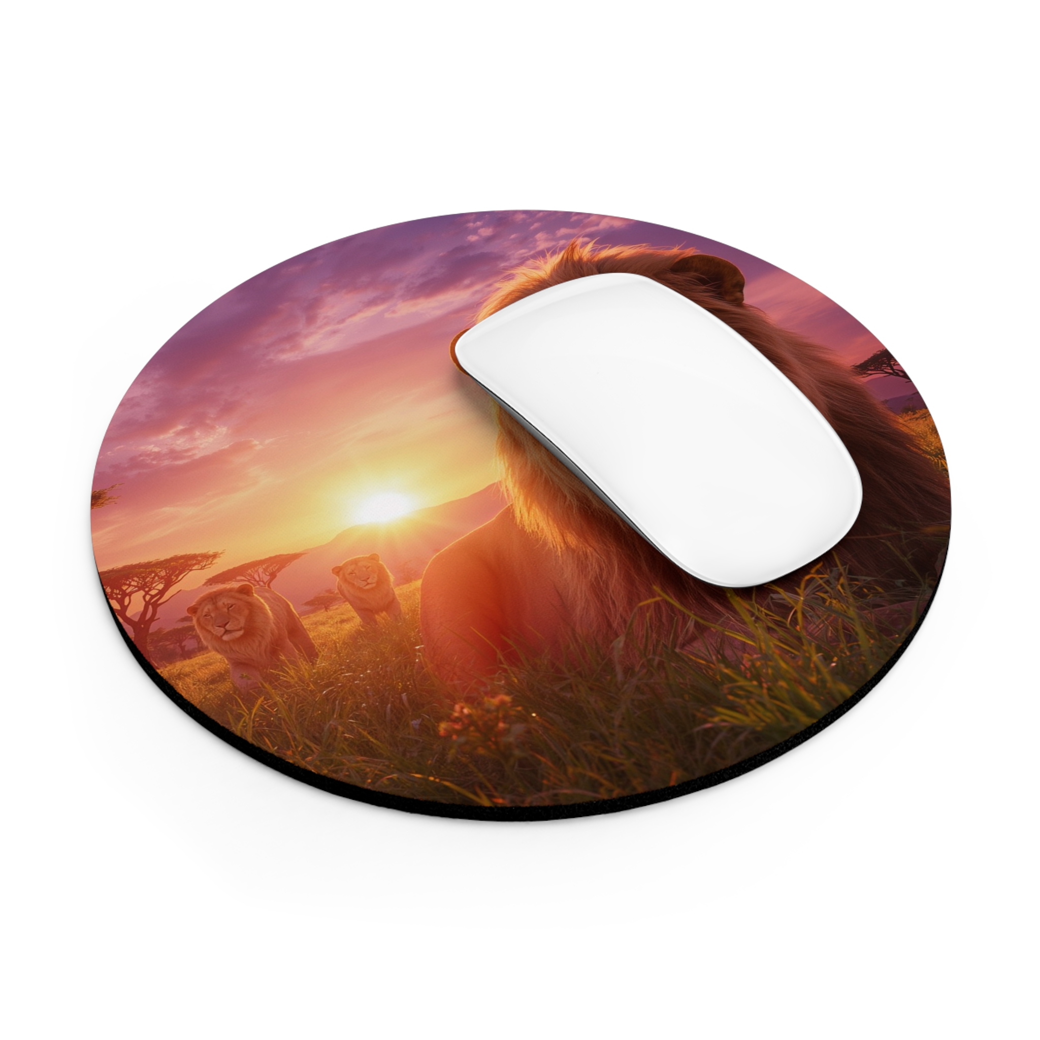 Bring the hush of golden hour on the savanna to your desk with this artful mouse pad. A regal lion gazes from a warm sunset scene rendered in vivid, luminous color — small details like tall grasses and distant acacia silhouettes peek through the glow. The smooth printed surface feels pleasant under your palm and helps your mouse glide; the soft neoprene base cushions long hours of work or play. This pad settles into creative workflows, keeps your space grounded, and quietly reminds you of quiet, wide-open places between tasks.